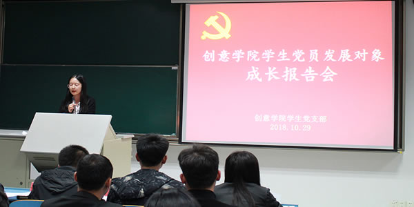 为提升创意学院学生党员发展质量,完善创意学院学生党建工作运行机制,10月29日晚上,创意学院学生党支部在5301开展学生党员发展对象成长报告会。创意学院党总支书记董裕乾、副书记顾广涛、所有辅导员及大一、大二各级学生干部参加的报告会,活动由学生党支部负责人董颖老师主持。