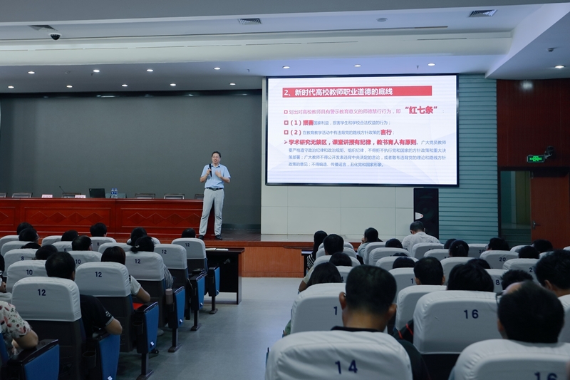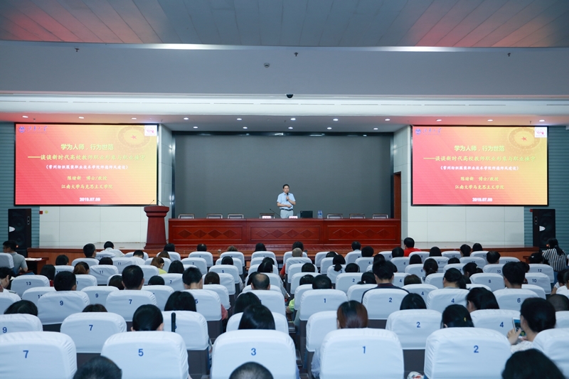 为深入贯彻落实习近平总书记关于师德建设的系列重要讲话精神和教育部《新时代高校教师职业行为十项准则》,加强我校师德师风建设,引导教师以德立身、以德立学、以德施教、以德育德,7月9日下午,我校在图文信息中心一楼报告厅举办了2019年师德师风专题讲座。全校300多名教师参加了本次学习,讲座由校党委委员、宣传部部长夏斌主持。