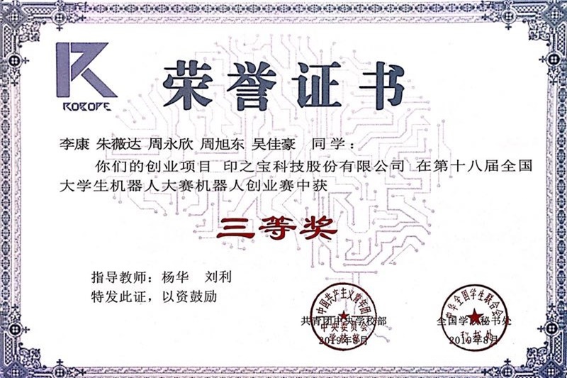 8月19-21日,由共青团中央、中华全国学联主办,共青团黑龙江省委、哈尔滨工业大学、黑龙江省工业技术研究院和宁波市高层次人才服务中心承办的第十八届全国大学生机器人大赛机器人创业赛在哈尔滨工业大学举行。我校机电学院团委推荐的科技苑参赛项目《印之宝科技股份有限公司》荣获三等奖,学校获得优秀组织奖。