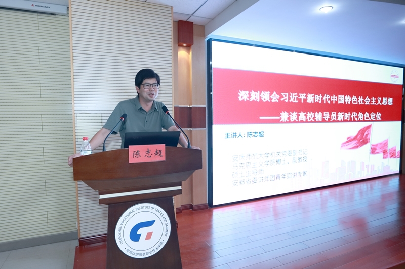 安庆师范大学机关党委副书记、马克思主义学院副教授、硕士生导师、安徽省委讲师团青年宣讲专家陈志超作了《深刻领会习近平新时代中国特色社会主义思想——兼谈高校辅导员新时代角色定位》的讲座。他从习近平新时代中国特色社会主义思想的理论背景和时代呼唤、新时代中国共产党人的思想旗帜、高校辅导员新时代角色定位等三个方面展开,提出高校辅导员要强化人格修养,做学术锤炼品格的引路人,要升级学识养成,做学生学习知识的引路人,优化行为模式,做学生创新思维的引路人,优化行为模式,做学生创新思维的引路人,传承家国情怀,做学生奉献祖国的引路人。