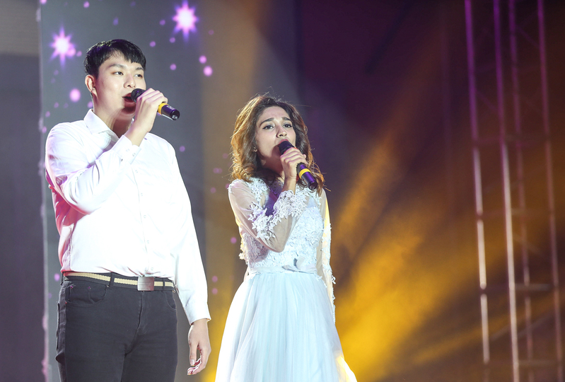 “圆梦篇章”中,机电学院和读者协会的朗诵《我们的中国》对祖国深情告白;国际学院的留学生代表通过歌曲《同一屋檐下》表达着对中国的热爱和对常纺的爱恋;服装学院和模特社的走秀表演《就在这瞬间》展现了近年来我校师生参加中国国际大学生时装周的风采;晚会的最后,学校党委班子全体走上舞台与在场全体师生一起齐唱《我和我的祖国》,所有人用豪迈的歌声,抒发对祖国、对时代、对教育事业的真挚情感,将晚会气氛推向了高潮。