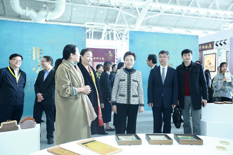 我校精心组织,精彩亮相。独具特色的展陈设计,精心挑选的展示作品,现场表演的乱针绣,掐丝珐琅技艺获得与会领导和参观嘉宾的一致赞扬。