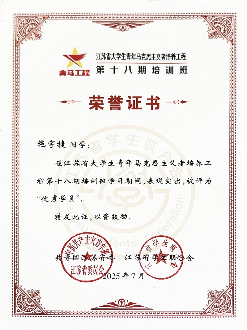 为深入学习贯彻党的二十大精神和习近平总书记关于青年工作的重要思想,引导广大青年增强政治素养和责任担当,由团江苏省委、江苏省学联主办的江苏省大学生青年马克思主义者培养工程第十八期培训班于2024年7月启动。经过一年的学习培养,我校智能制造学院施宇捷同学圆满完成了理论学习、红色教育、实践锻炼、作风养成、交流研讨等各项培训任务,顺利结业,获评“优秀学员”荣誉称号!