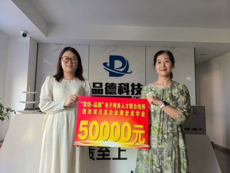 常州品德数码科技有限公司向数字商贸学院捐赠了五万元人民币,用于“常纺-品德”电商人才联合培养教改项目及企业课堂的奖学金发放。