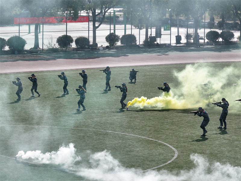 随后的军事科目汇报演示更是精彩纷呈,将现场气氛推向高潮。“飒爽英姿五尺枪,曙光初照演兵场。”在这片朝气蓬勃的演兵场上,动若雷霆的刺杀操、敏捷凌厉的匕首操、刚劲有力的擒敌拳以及紧张逼真的反恐战术模拟依次上演。同学们斗志昂扬,动作精准连贯,不仅展示了扎实的军事技能,更凸显了常纺院学子团结协作、纪律严明的优良作风与蓬勃朝气。